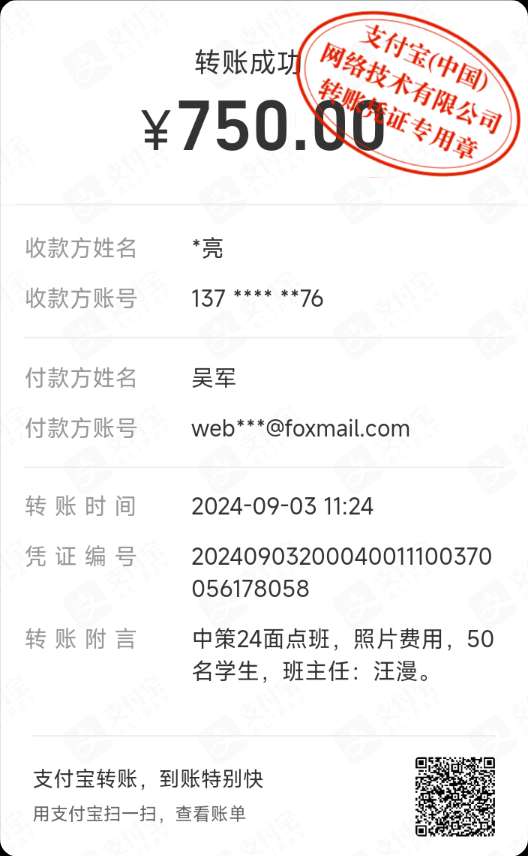 各位家长,学生拍照费,每位同学15元,本班50位同学,共计750元。该笔款项由班费支付,不再向家长另行收取。以上截图为向校方转账之凭证。