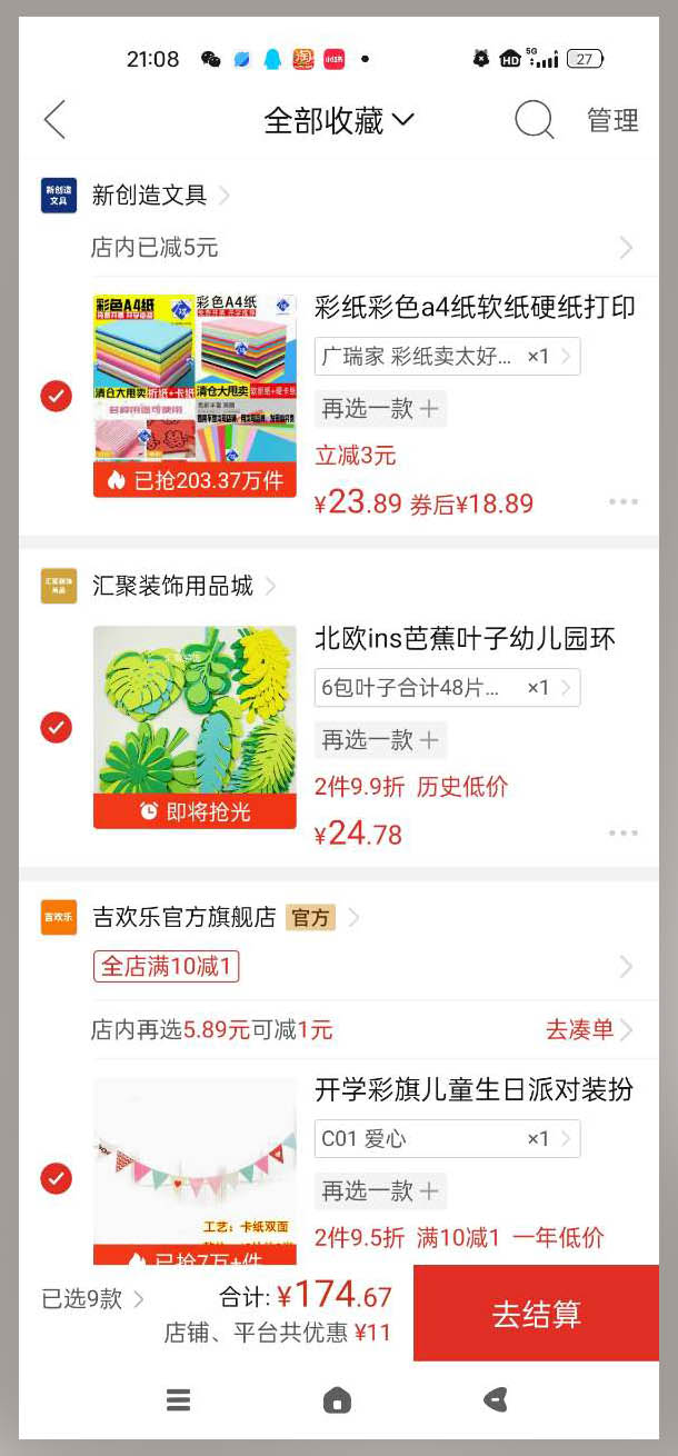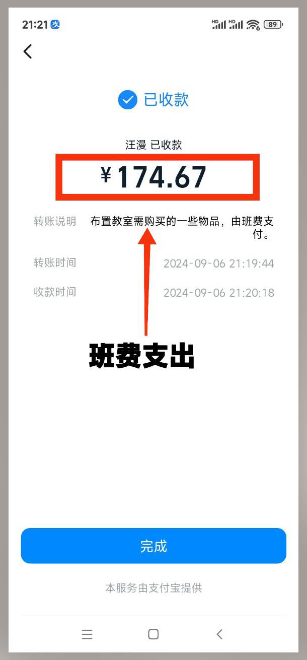 购买班级布置的一些物品,共计:174.67元,该笔款项由班费支付。