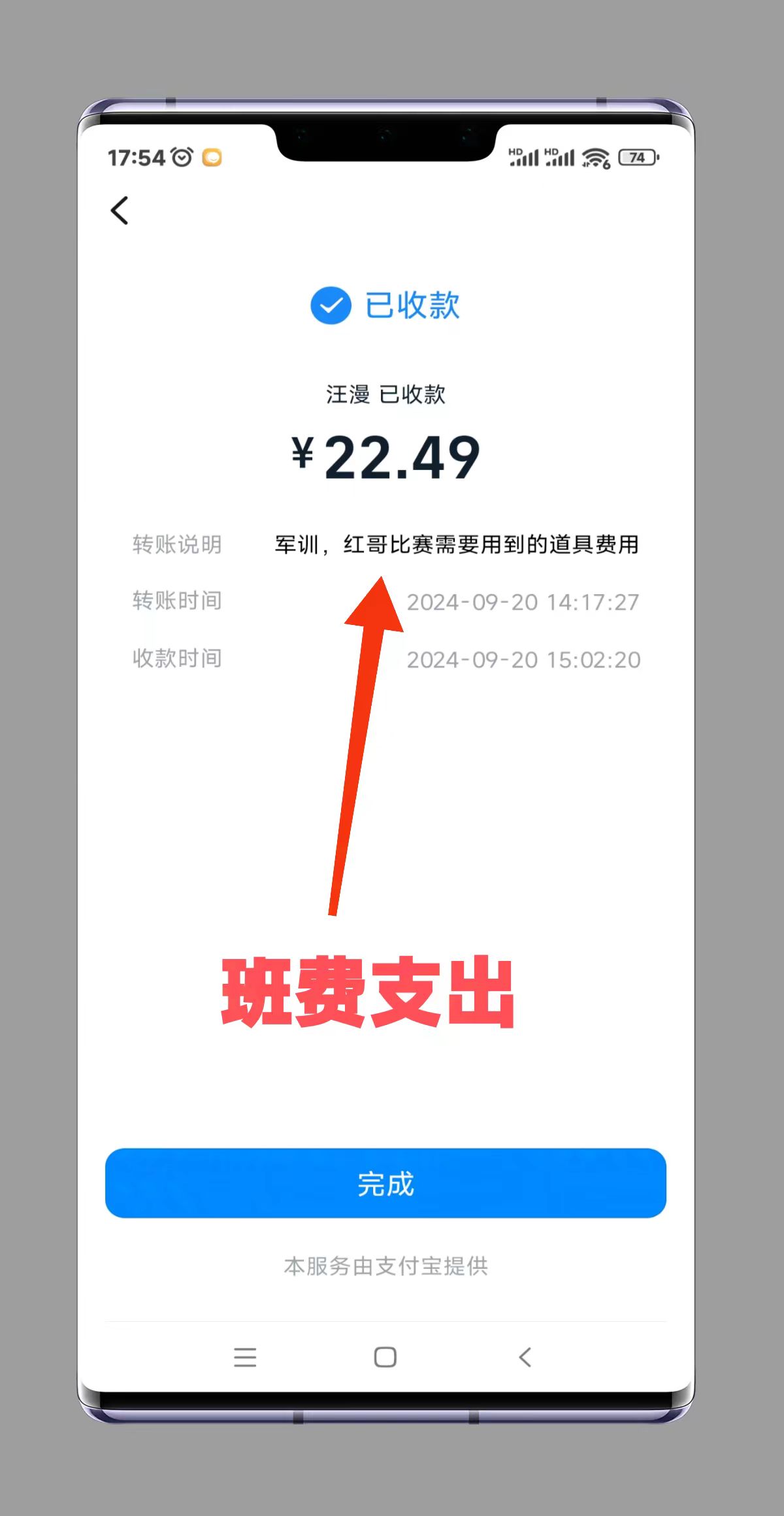 军训、红歌比赛需要用到的一些道具费用,共计:22.49元。该笔费用由班费支付!